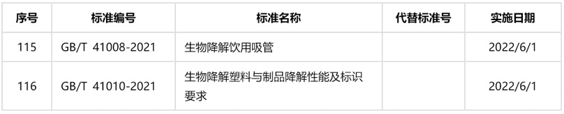 2021年11月26日,国家市场监督管理总局、国家标准化管理委员会发布公告,《GB/T 41010-2021 生物降解塑料与制品降解性能及标识要求》、《GB/T 41008-2021 生物降解饮用吸管》两个国家推荐性标准将于2022年6月1日实施。 关于GB/